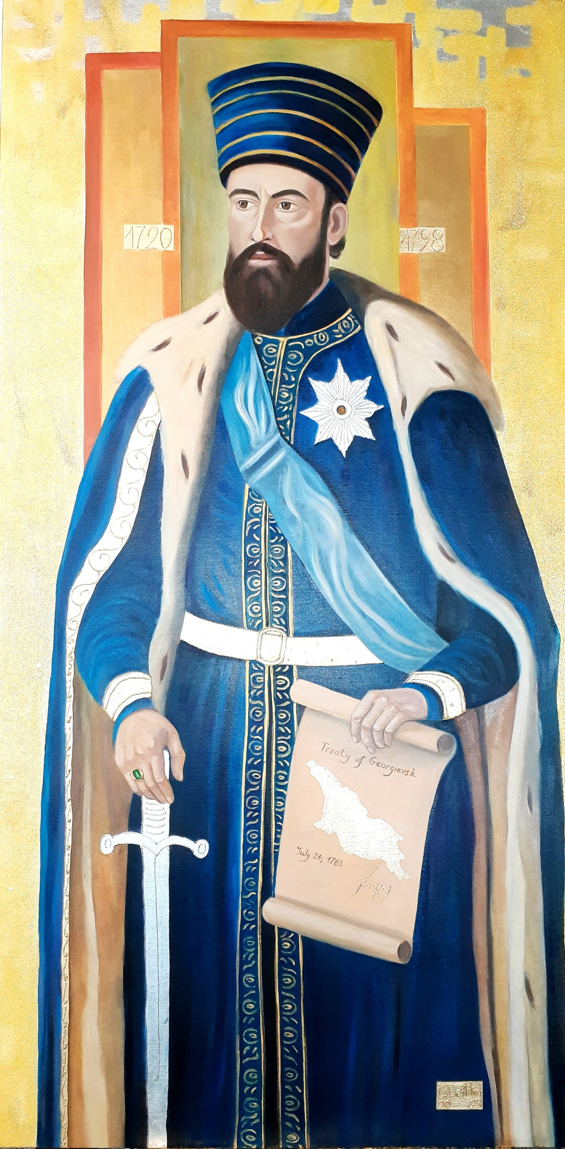 A commanding 30 x 90-inch oil painting of King Heraclius II, depicted with regal dignity in deep blue robes and fur-trimmed mantle. Holding the Treaty of Georgievsk and a ceremonial sword, the portrait blends historical symbolism with expressive colour and gold accents, honouring the strength, resilience, and leadership of one of Georgia’s most influential monarchs.